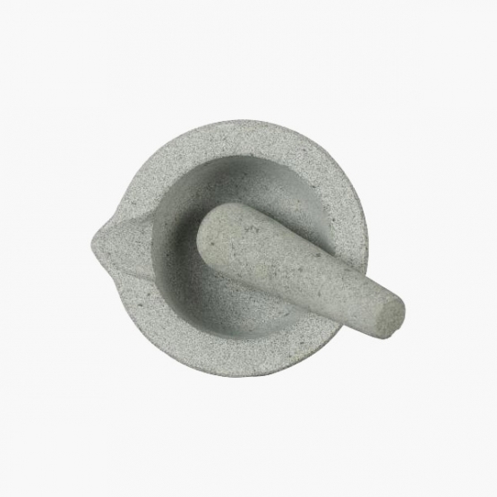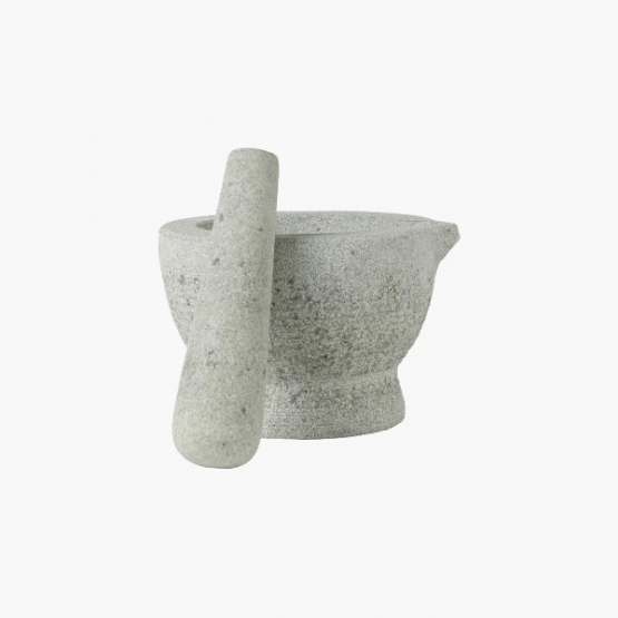 Kraftig morter fremstillet i granit, der er rå udvendig og glat indvendig. Redskabet bruges til at støde saft og smagsstoffer ud af frugter, krydderurter og hvad du ellers skulle have lyst til at blande i dine drinks. Denne morter har en diameter på 15 cm i toppen og en højde på 10 cm. Den medfølgende støder måler 14 cm.